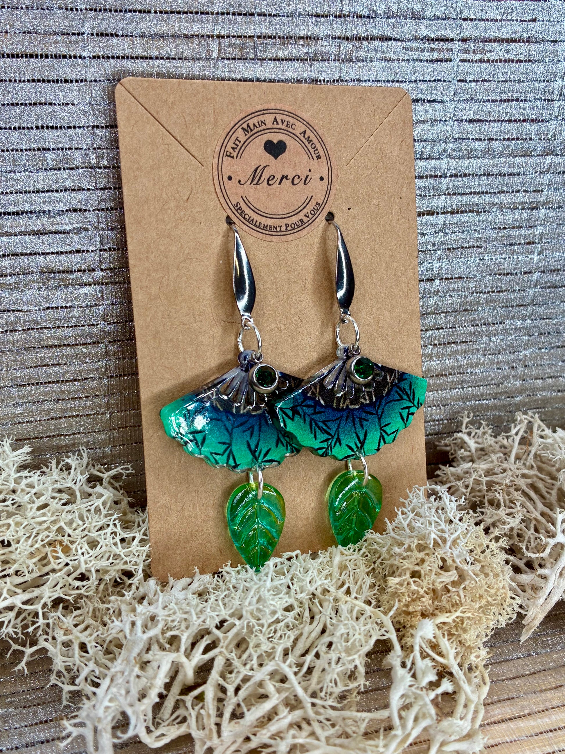 Boucles d’oreilles argentées acier inoxydable , éventails 🪭 en résine, petites feuilles en verre