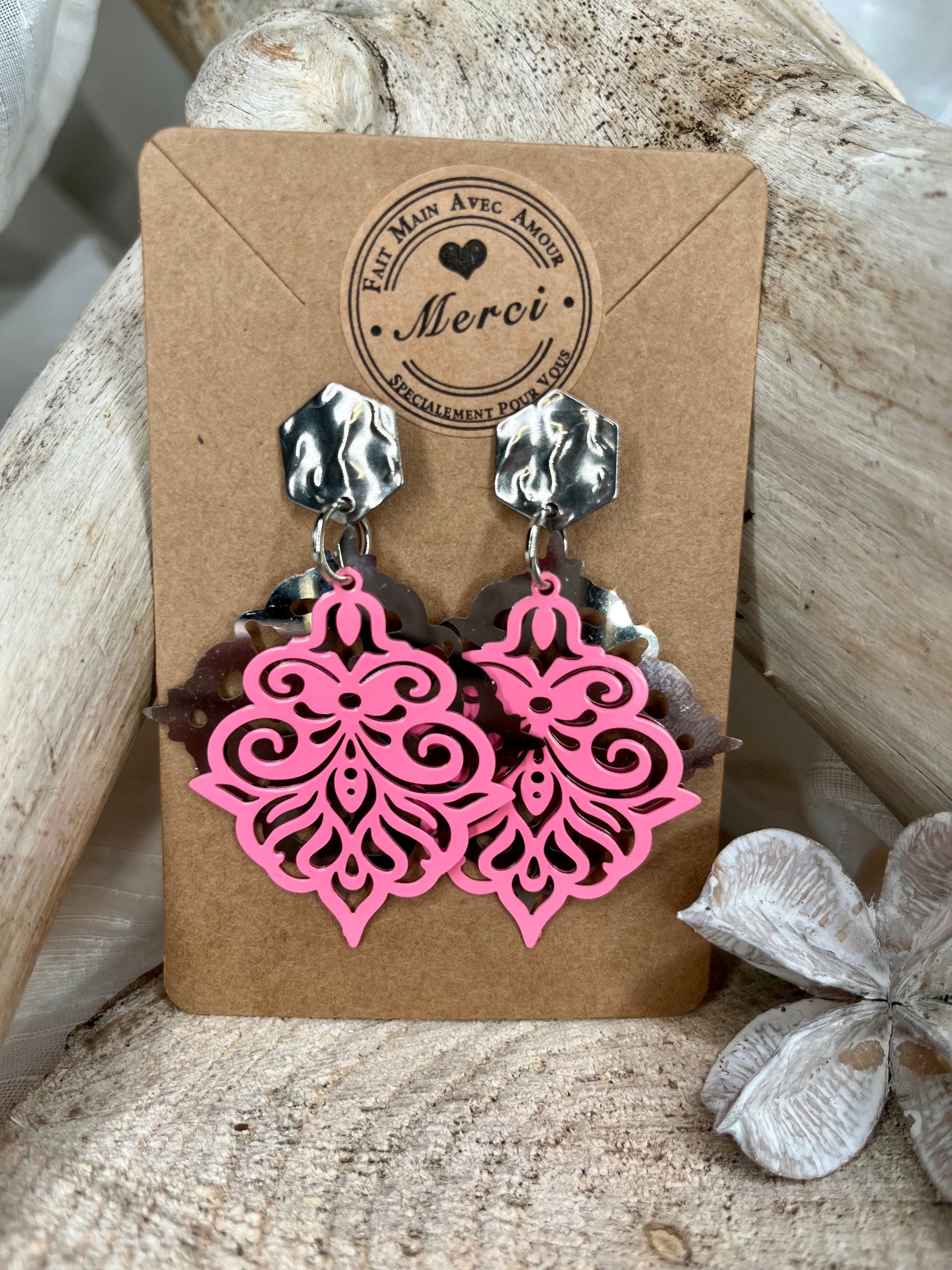 Boucles d’oreilles argentées et roses en acier inoxydable