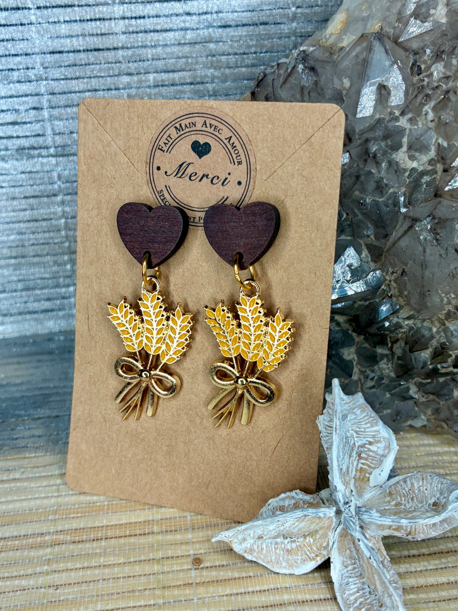 Boucles d’oreilles 🌾 dorées acier et bois