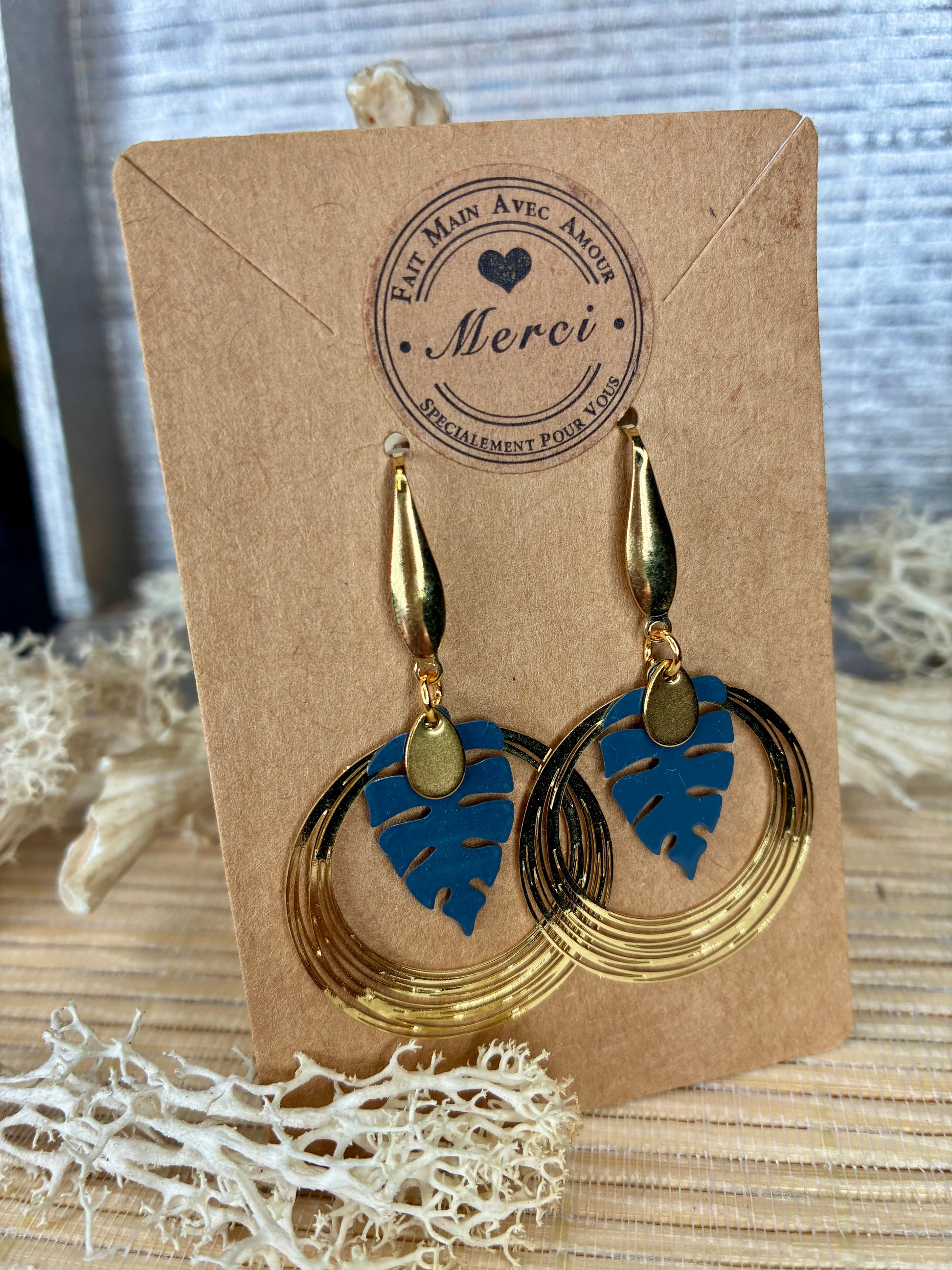 Boucles d’oreilles dorées petites feuilles bleues marine acier inoxydable