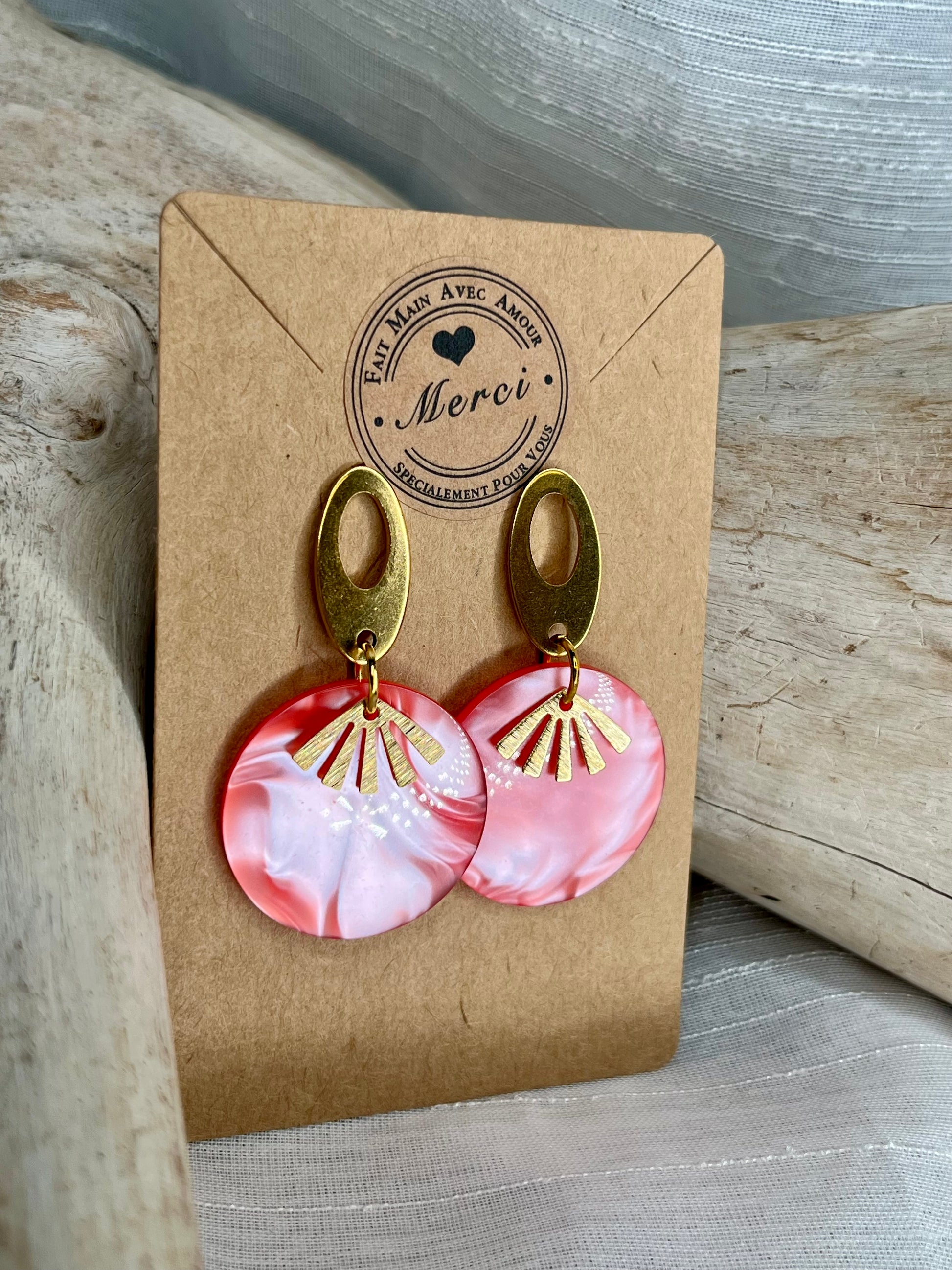 Boucles d’oreilles dorées et résine couleur corail