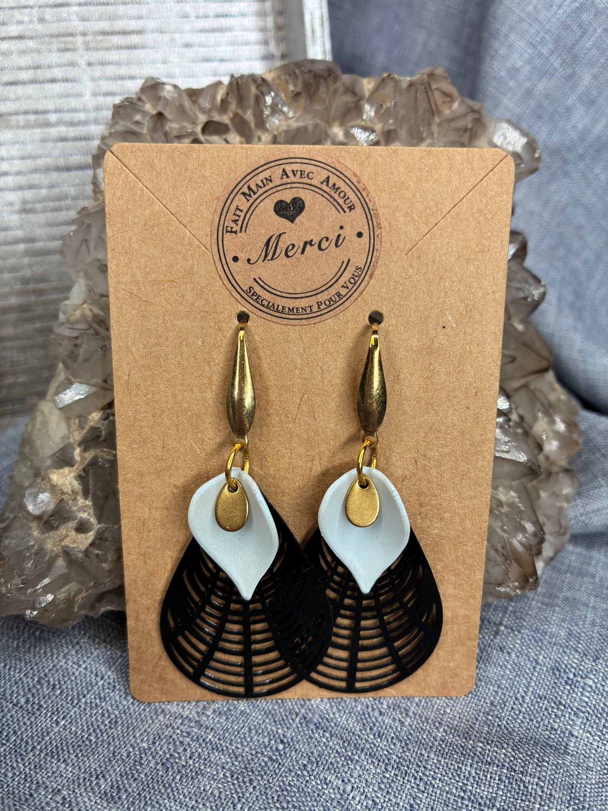 Boucles d’oreilles dorées , noires et petites pétales en résine blanche