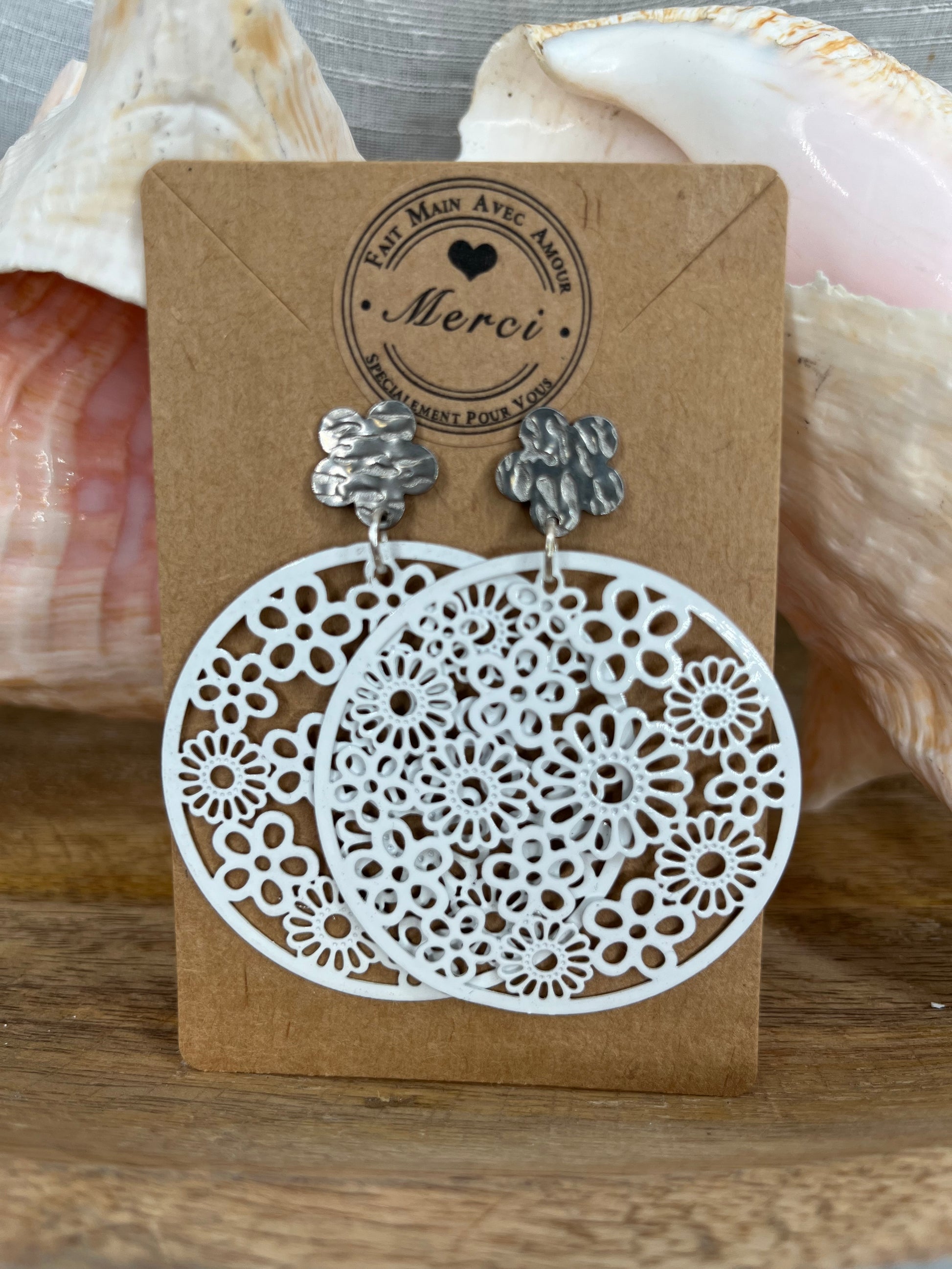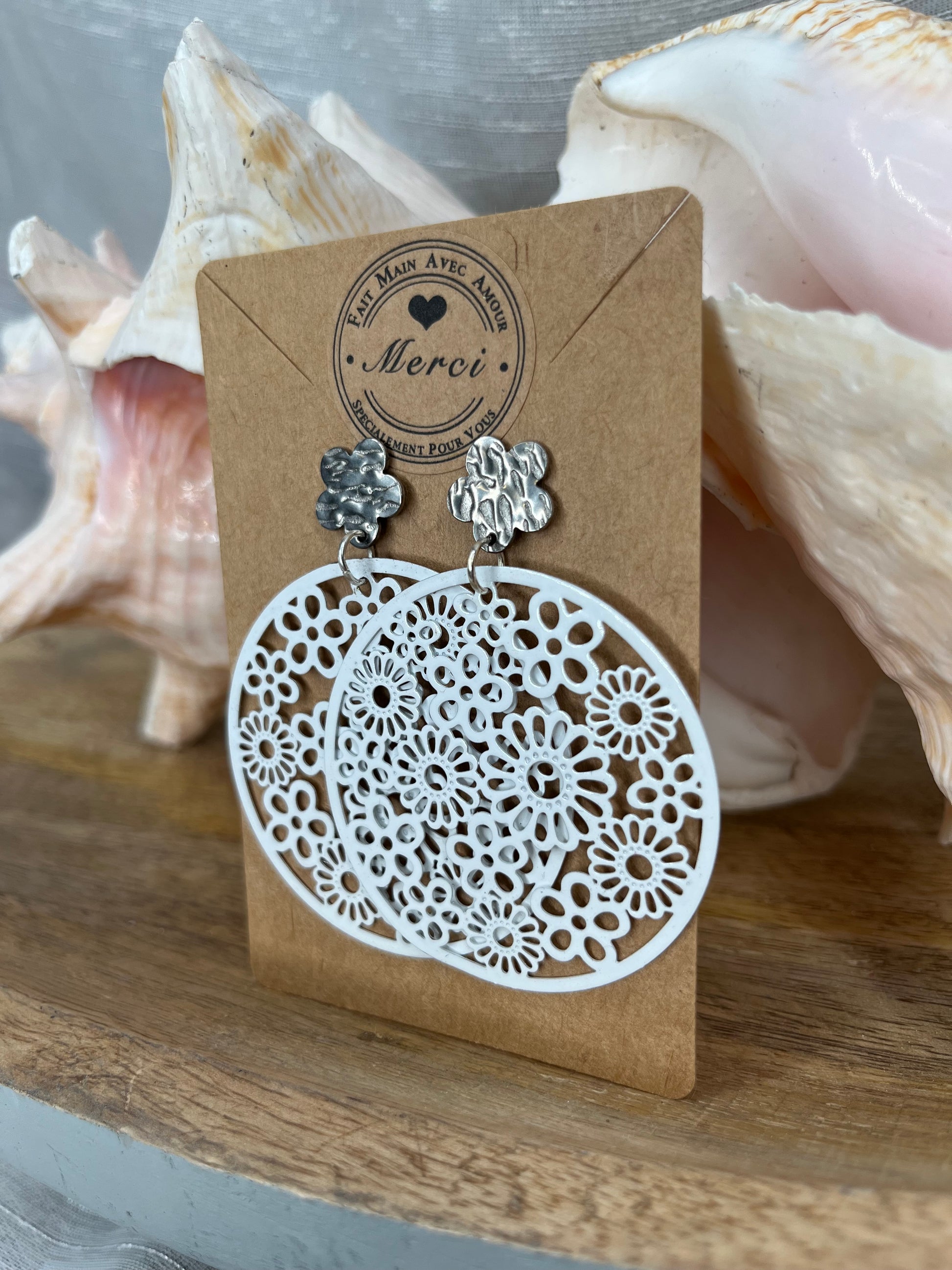 Boucles d’oreilles argentées, estampes fleuries blanches acier inoxydable