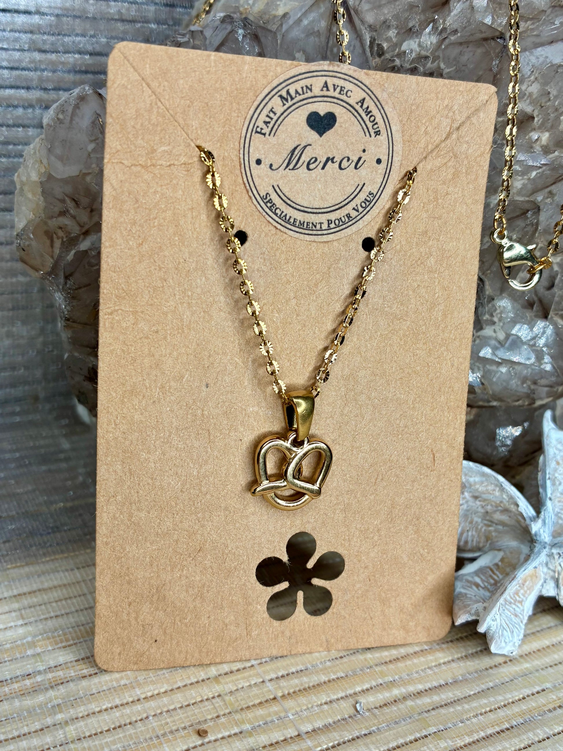 Collier chaîne dorée en acier inoxydable , pendentif bretzel 🥨 en forme de cœur acier inoxydable