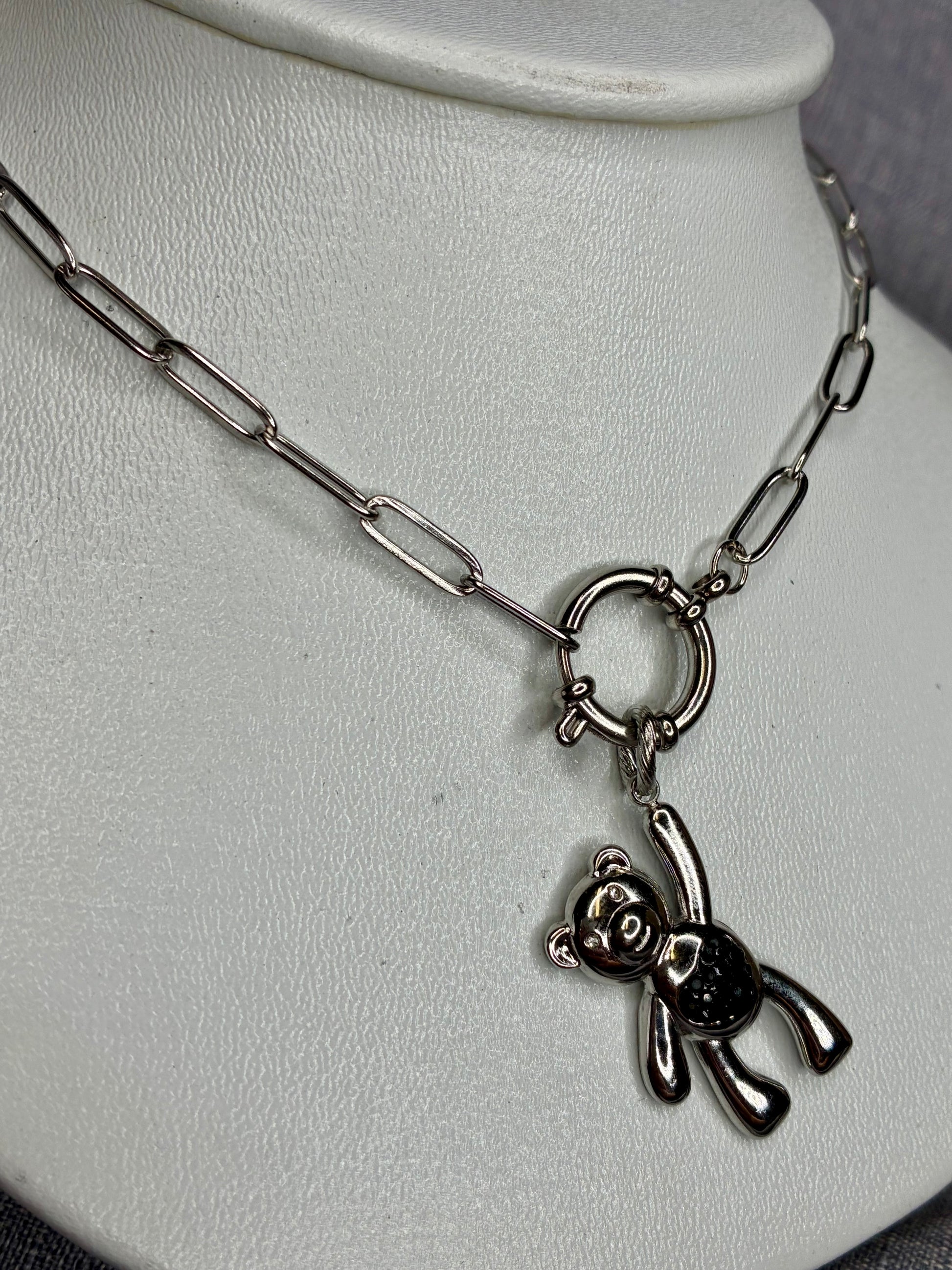 Collier chaîne argentée acier inoxydable pendentif ours, petits strass noirs en forme de cœur sur le ventre