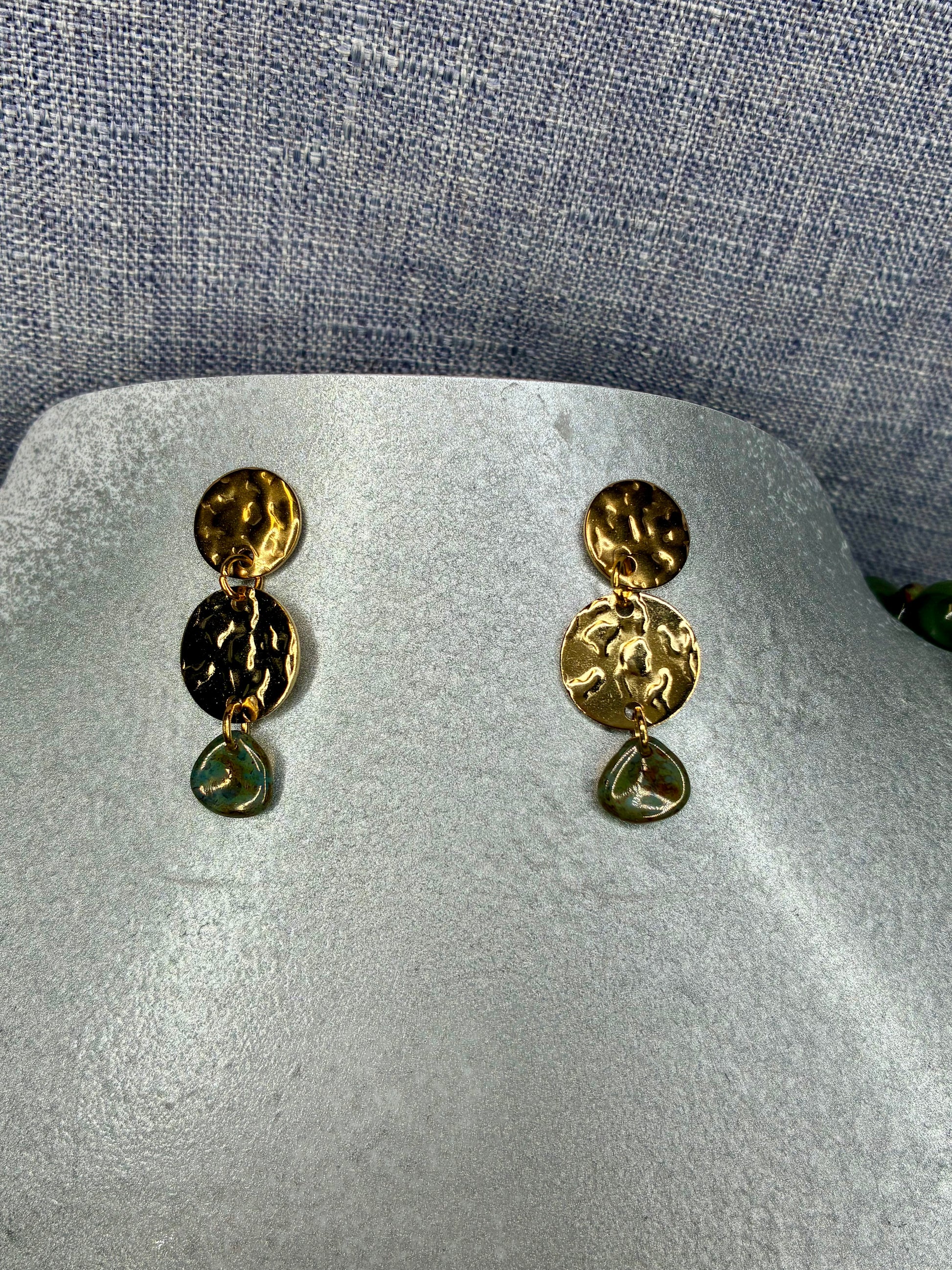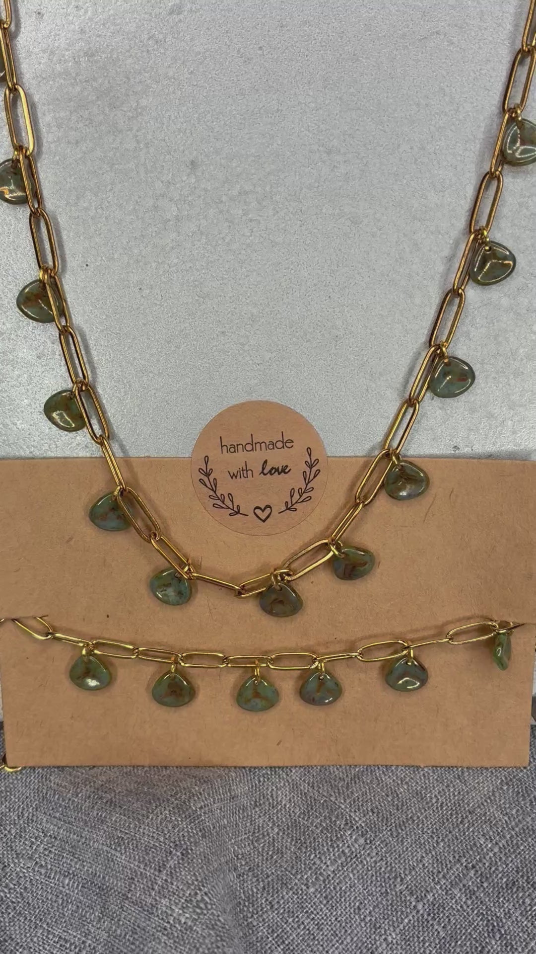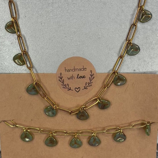 Parure dorée en acier inoxydable, perles en verre kaki